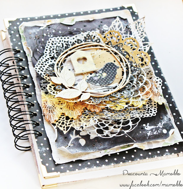 Planner ślubny w kolorach: czarny, szary i złoty. Cała kompozycja opiera się na wielu warstwach ażurowych serwetek. Na tym, co wychodzi spod moich rąk, często gości motyw koronki. Tutaj użyłam gipiury i potraktowałam ją mgiełkami. Oto efekt:
